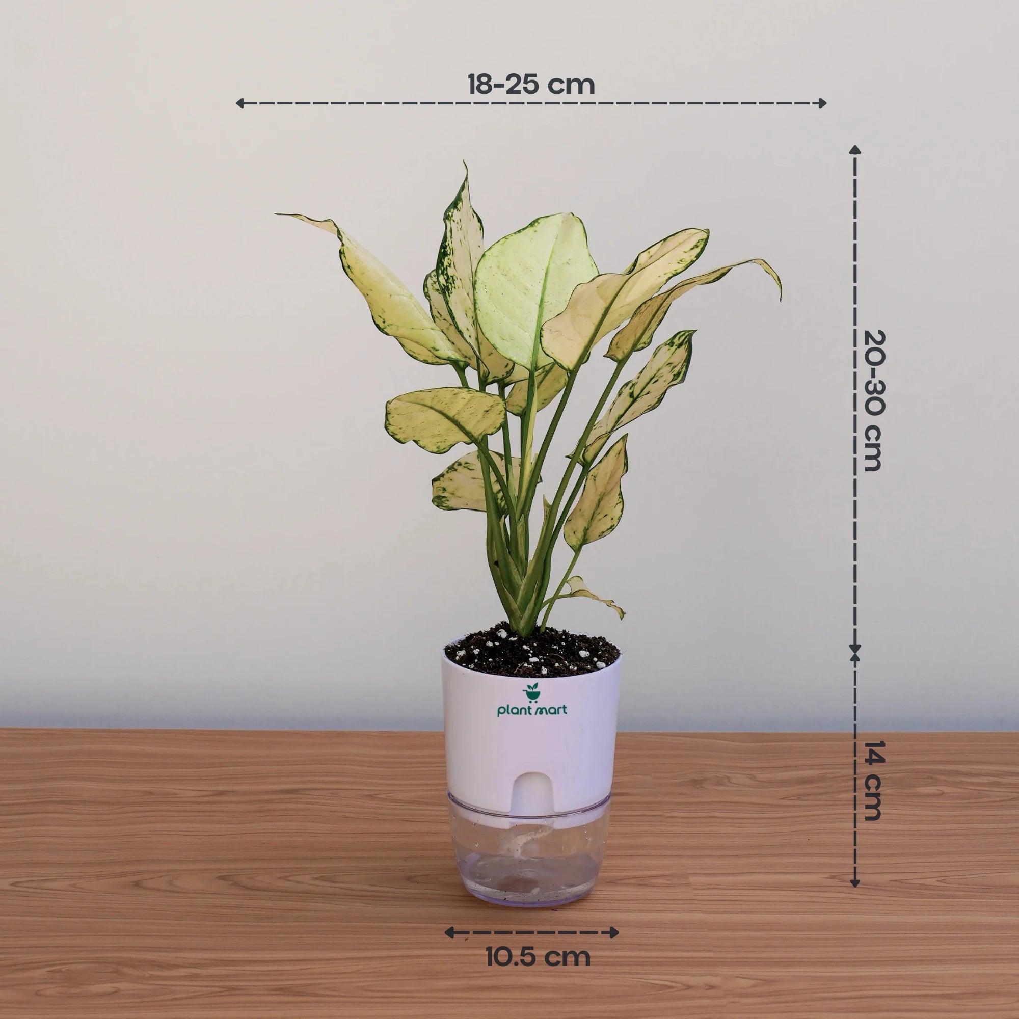 Botanical Name: Aglaonema Snow White Common Name: Chinese Evergreen (Snow White) Pot Type: Premium Self-Watering Pot (Medium) Plant Height: Approx. 10–12 inches Light Requirement: Medium to low indirect light Maintenance: Extremely easy, low-care plant Air Purifying: Helps remove toxins and enhances indoor air quality Ideal Placement: Offices, bedrooms, study tables, and shaded corners🪴 Plant Care Guide